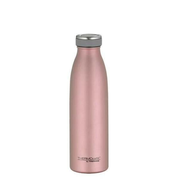 Die edle Isolierflasche der Serie ThermoCafé von Thermos hält absolut dicht. Die rosafarbene Flasche fasst 0,5 Liter.